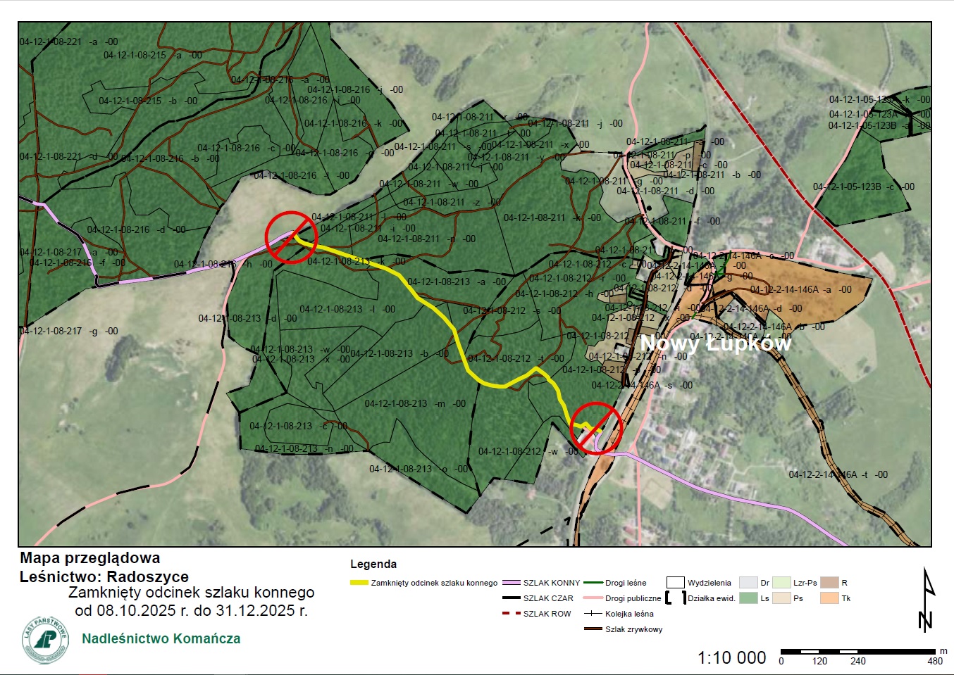 W związku z prowadzonymi pracami z zakresu pozyskania i zrywki drewna w oddz. 213 m terminie 08.10.2025-31.12.2025r. fragmentu Transbeskidzkiego Szlaku Konnego Brenna – Wołosate będzie zamknięty. (szczegóły w załączniku)