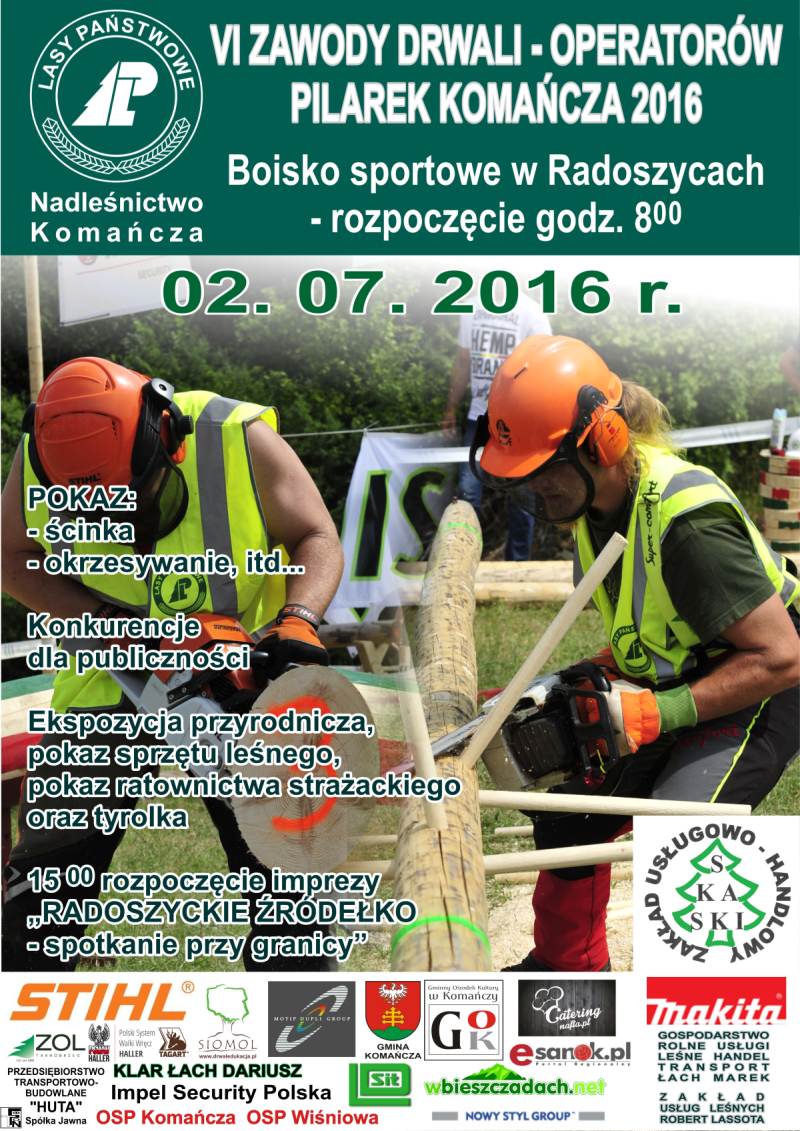 Nadleśnictwo Komańcza oraz Lokalna Grupa Przedsiębiorców Leśnych zapraszają na VI ZAWODY DRWALI - OPERATORÓW PILAREK Komańcza, które odbędą się 02 lipca 2016 r. w Radoszycach. Rozpoczęcie o godz. 800